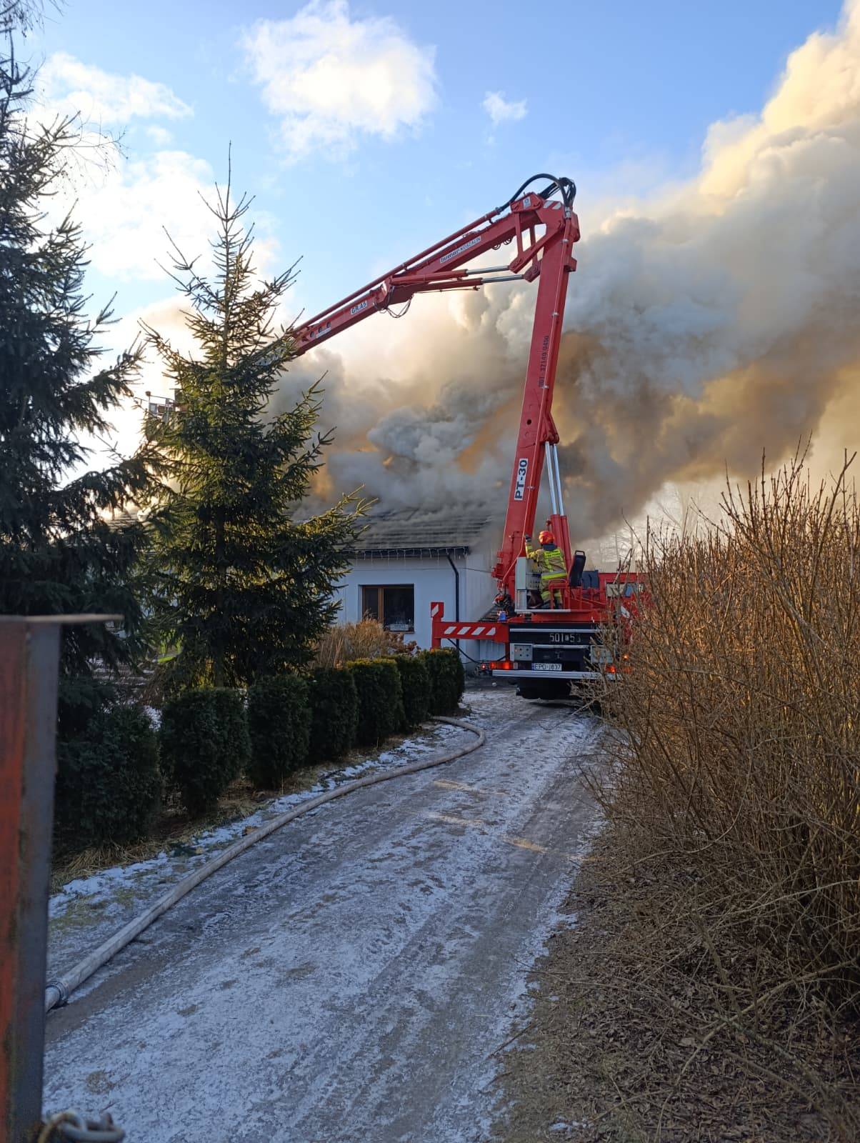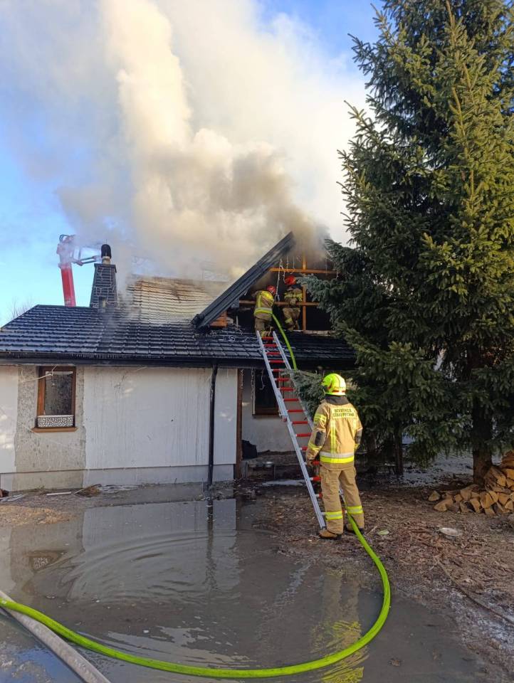 Po dotarciu na miejsce zdarzenia strażacy zastali palący się dach budynku, którego znaczna część była już objęta ogniem. W chwili wybuchu pożaru właściciel domu przebywał poza obiektem.