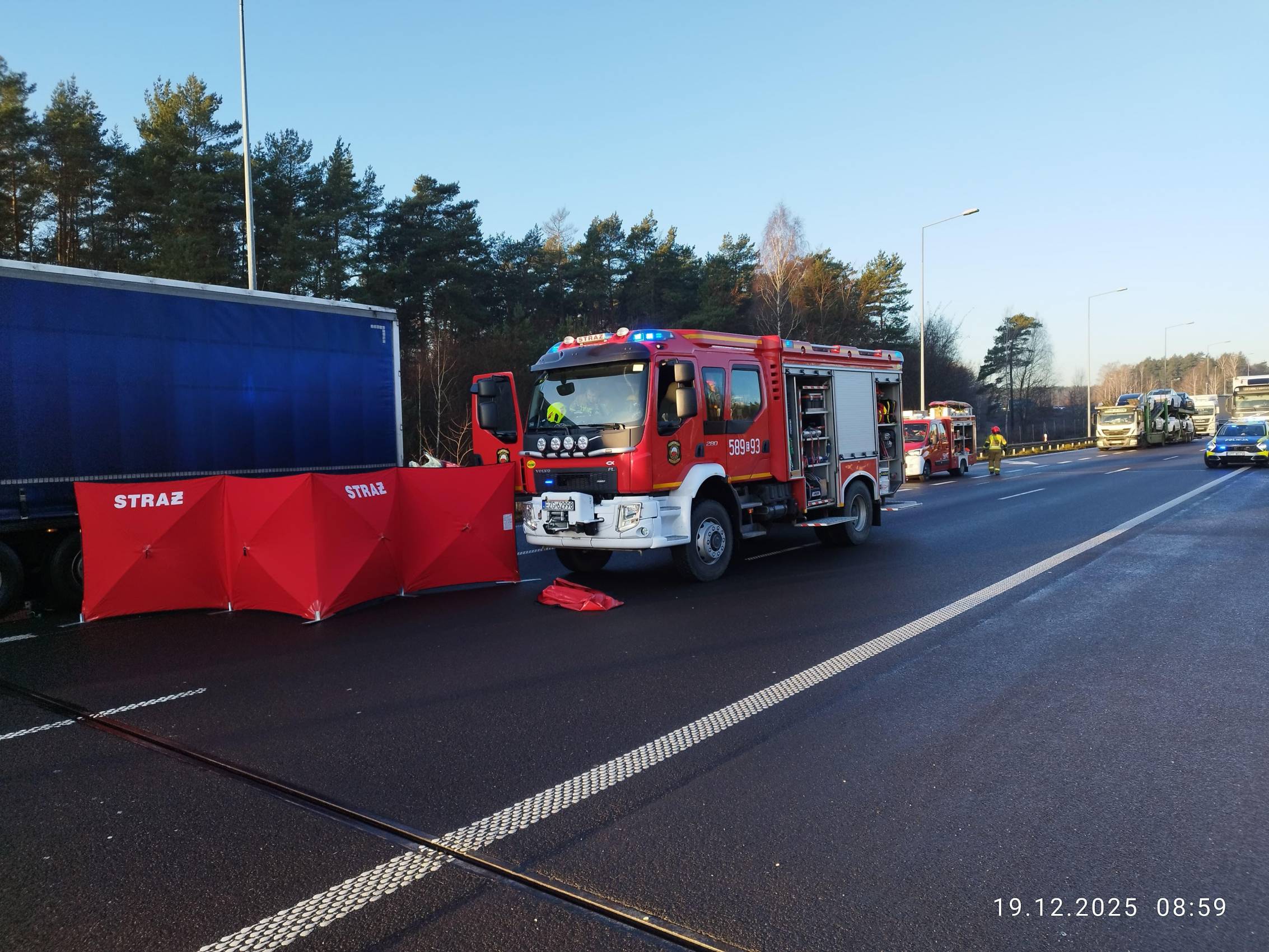 Do zdarzenia doszło po godzinie 8.00 na 349. kilometrze autostrady. Samochód osobowy najechał na tył pojazdu ciężarowego, wbijając się pod jego naczepę. Na miejsce natychmiast skierowano służby ratunkowe. Strażacy musieli użyć specjalistycznego sprzętu, aby wydobyć kierowcę z rozbitego auta.