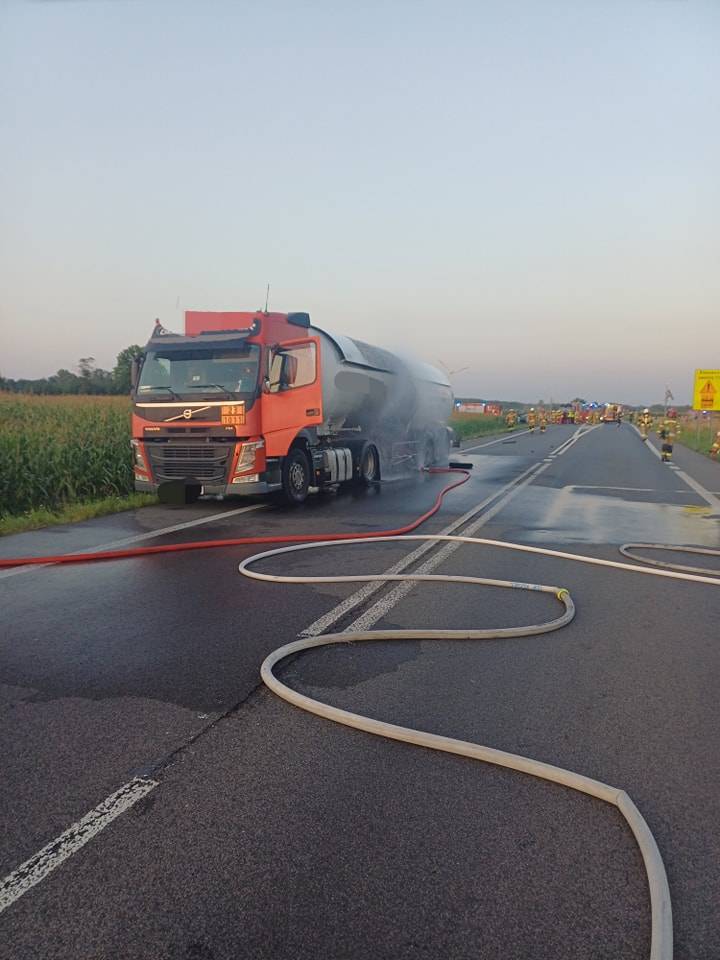 Zderzenie cysterny z gazem i osobówki. Ładunek stanął w ogniu, jeden z kierowców zabrany LPRem do szpitala. DK 74 zablokowana do rana [Foto]